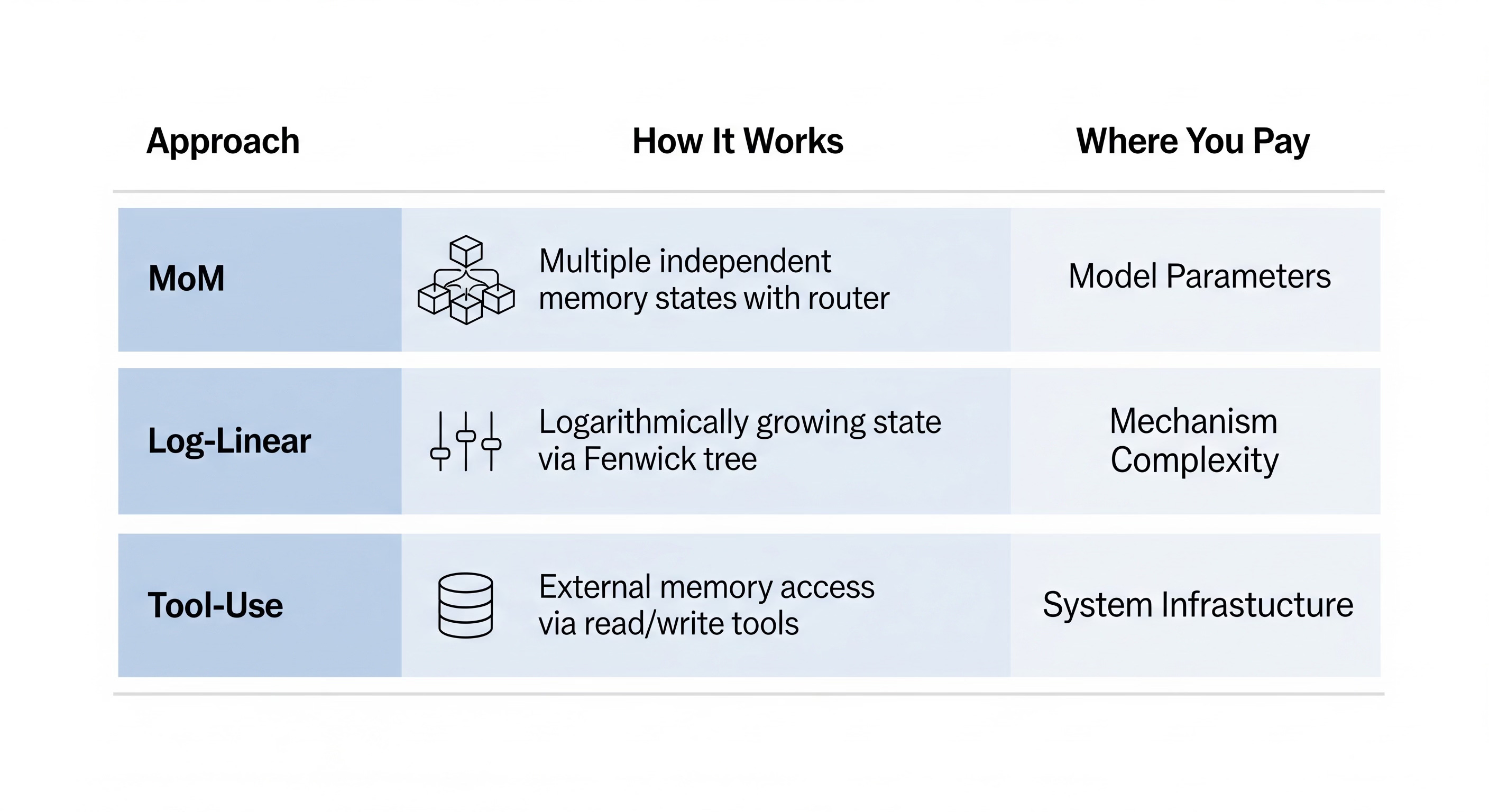 All three approaches are variants of “add more state.” They differ in where you pay the cost. MoM pays inside the model parameters. Log-Linear pays in the attention mechanism. Tool-use pays outside the model in system complexity. No free lunch, just different checks to different accounts.