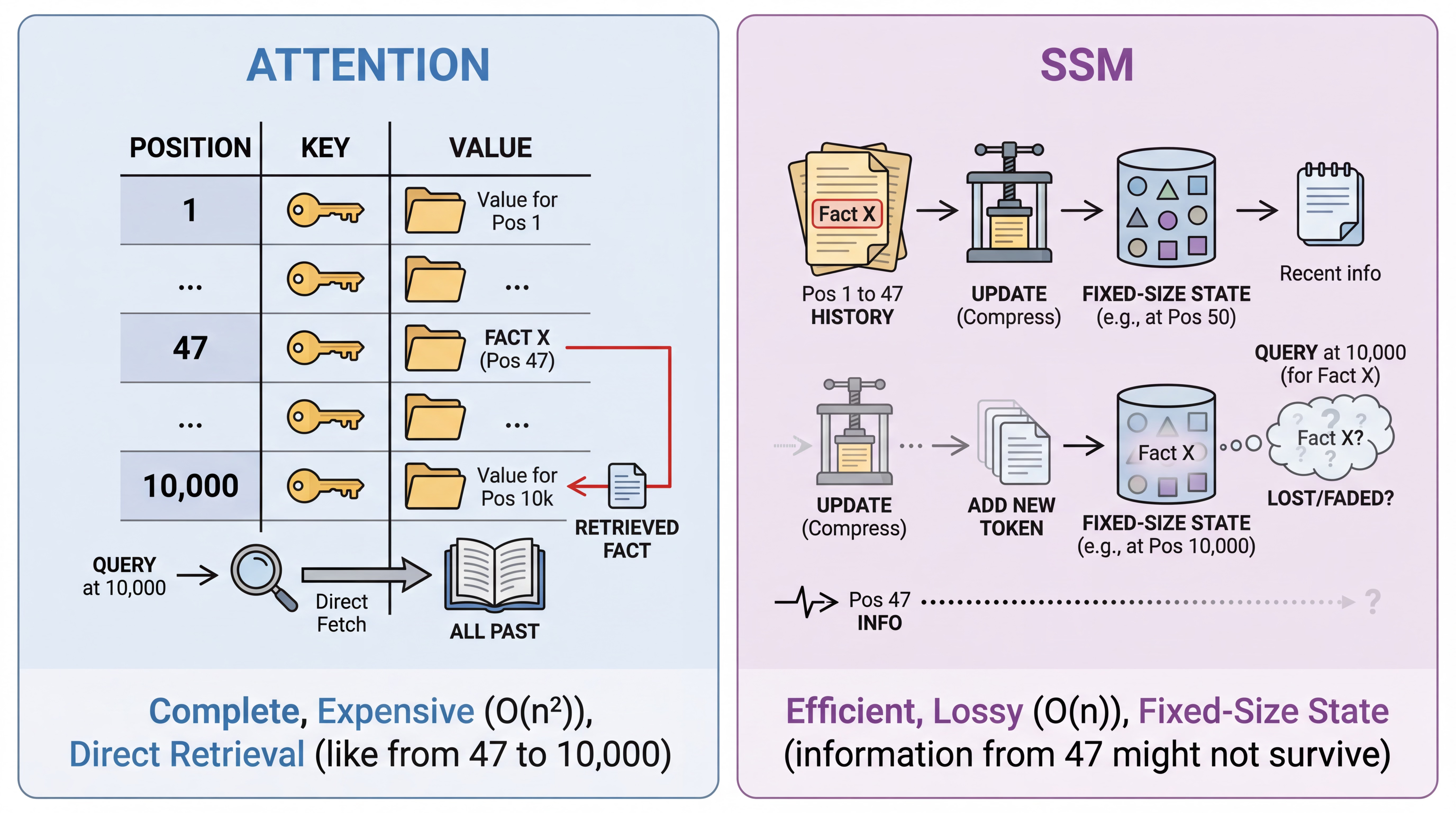 Attention works like a lookup table. The model stores keys and values for every position, then retrieves what it needs. When something from position 47 matters for predicting position 10,000, attention can fetch it directly. This is expensive (quadratic in sequence length) but complete.