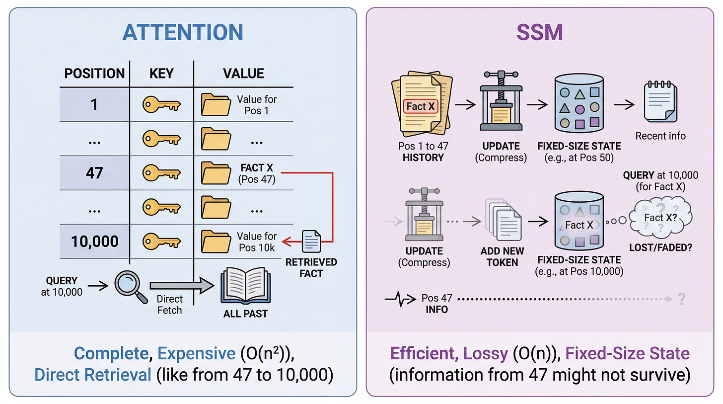 SSMs work differently. They compress the entire history into a fixed-dimensional state vector that updates with each new token. The state carries forward information about everything that came before, but it can only hold so much. When the model needs information from position 47 at position 10,000, that information either survived thousands of state updates or got overwritten by more recent content.